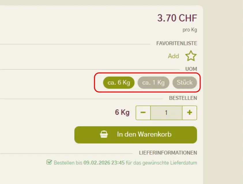 Die Reihenfolge der Bestelleinheiten im Shop war bisher nicht einheitlich. Das haben wir korrigiert. Neu wird immer die grösste Einheit zuerst angezeigt und als Standard ausgewählt.